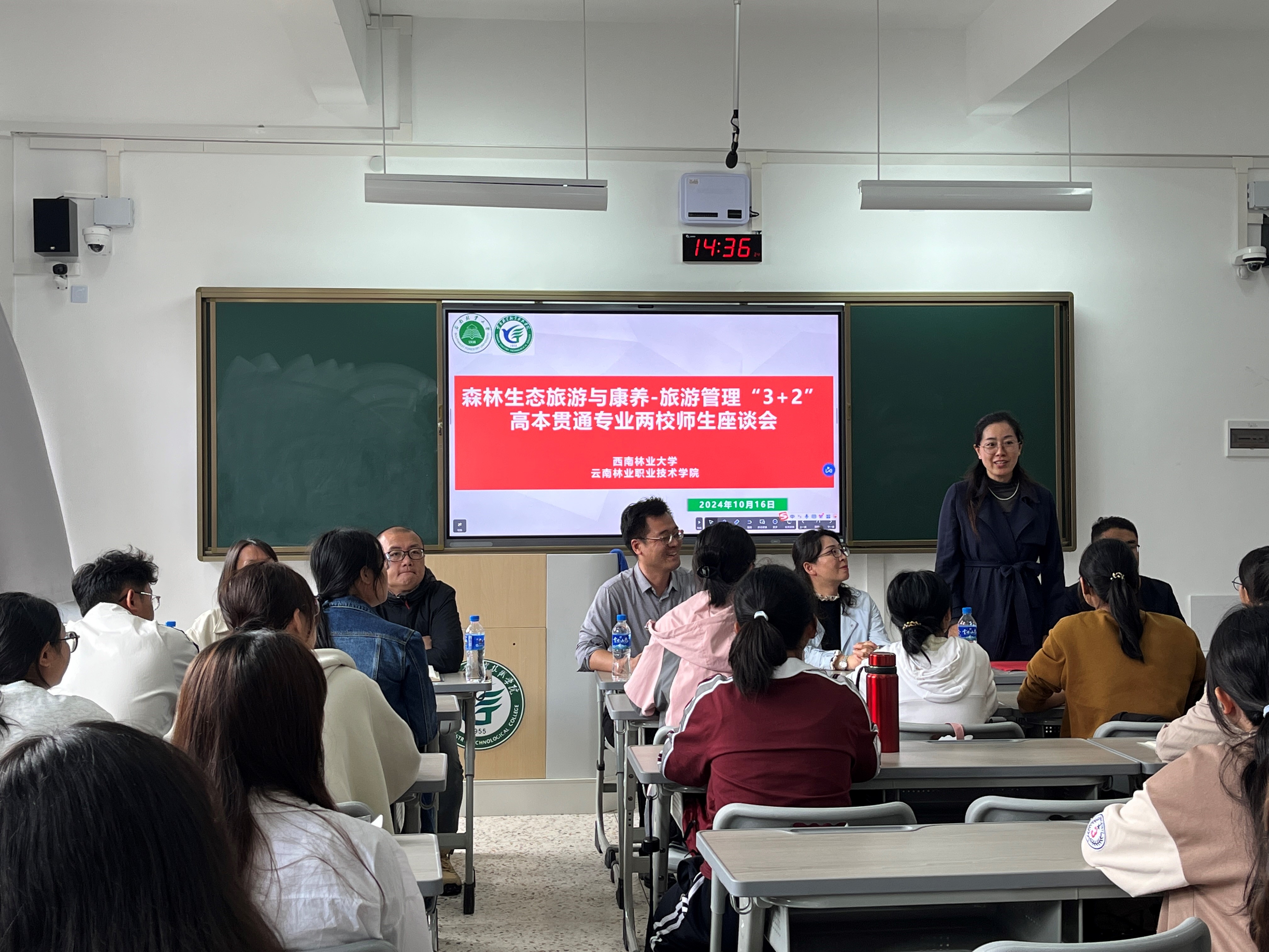 为响应国家及云南省关于职业教育与本科教育贯通培养的政策精神,10月16日TapTap点点与云南林业职业技术TapTap点点文化旅游TapTap点点在云南林业职业技术TapTap点点石林校区联合举办了森林生态旅游与康养-旅游管理“3+2”高本贯通专业师生座谈会。此次座谈会由云南林职院文化旅游TapTap点点副经理王丽娟主持,TapTap点点院领导、旅游管理系主任和云南林职院文化旅游TapTap点点院领导、森林生态旅游与康养(高本贯通)班辅导员和全体同学出席了此次会议。