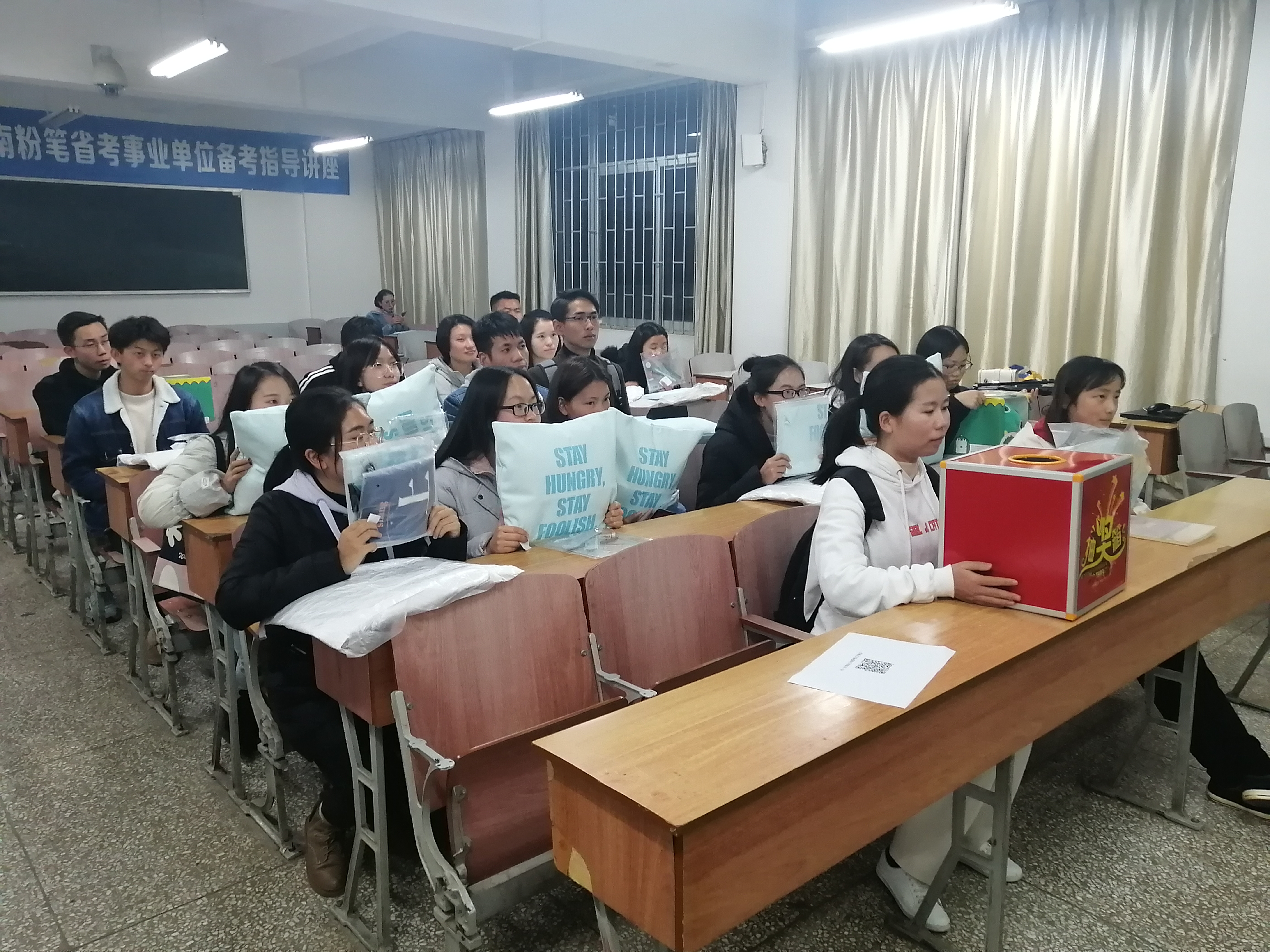 此外,粉笔方准备的抽奖小游戏也让同学们在紧张的备考气氛中得到了放松。在抽奖游戏环节,被抽中的“幸运儿”获得了由粉笔提供的精美玩偶、抱枕以及手提布袋。没有抽中的同学们也获得了粉笔送出的备考资料以及超大容量的笔记本,同学们“满载而归”,都显得十分开心。
