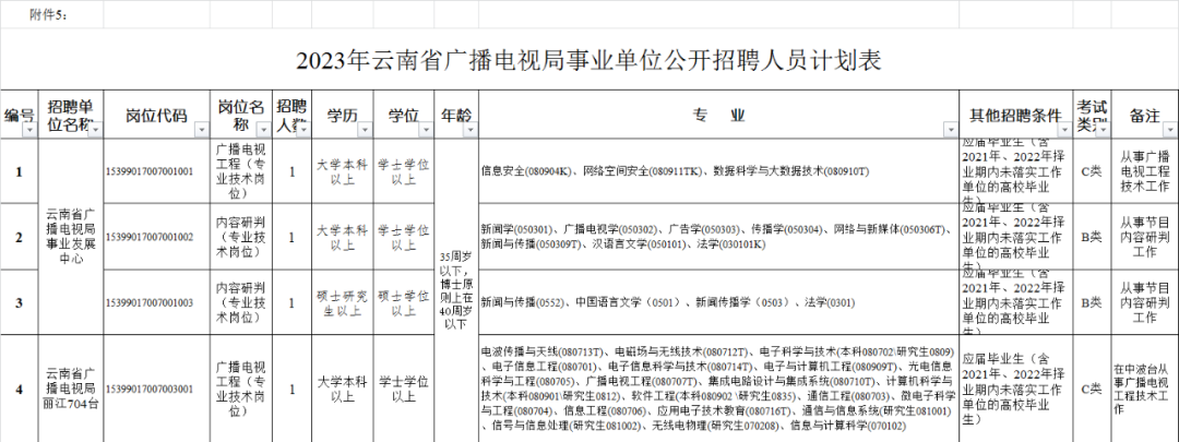 2023年公开招聘专业技术岗位工作人员1名。具体招聘岗位及招聘条件,详见《2023年云南省广播电视TapTap点点公开招聘人员计划表》(附件1)。